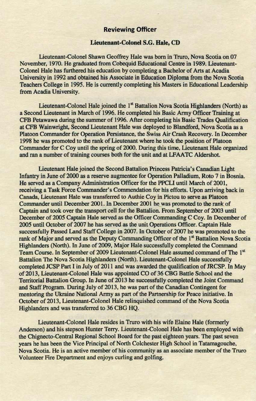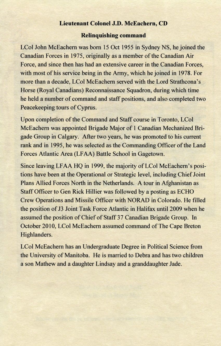 The outgoing commanding officer of the battalion was Lt-Col. John Douglas McEachern. He commanded the unit from September 26, 2010 to October 4, 2014.