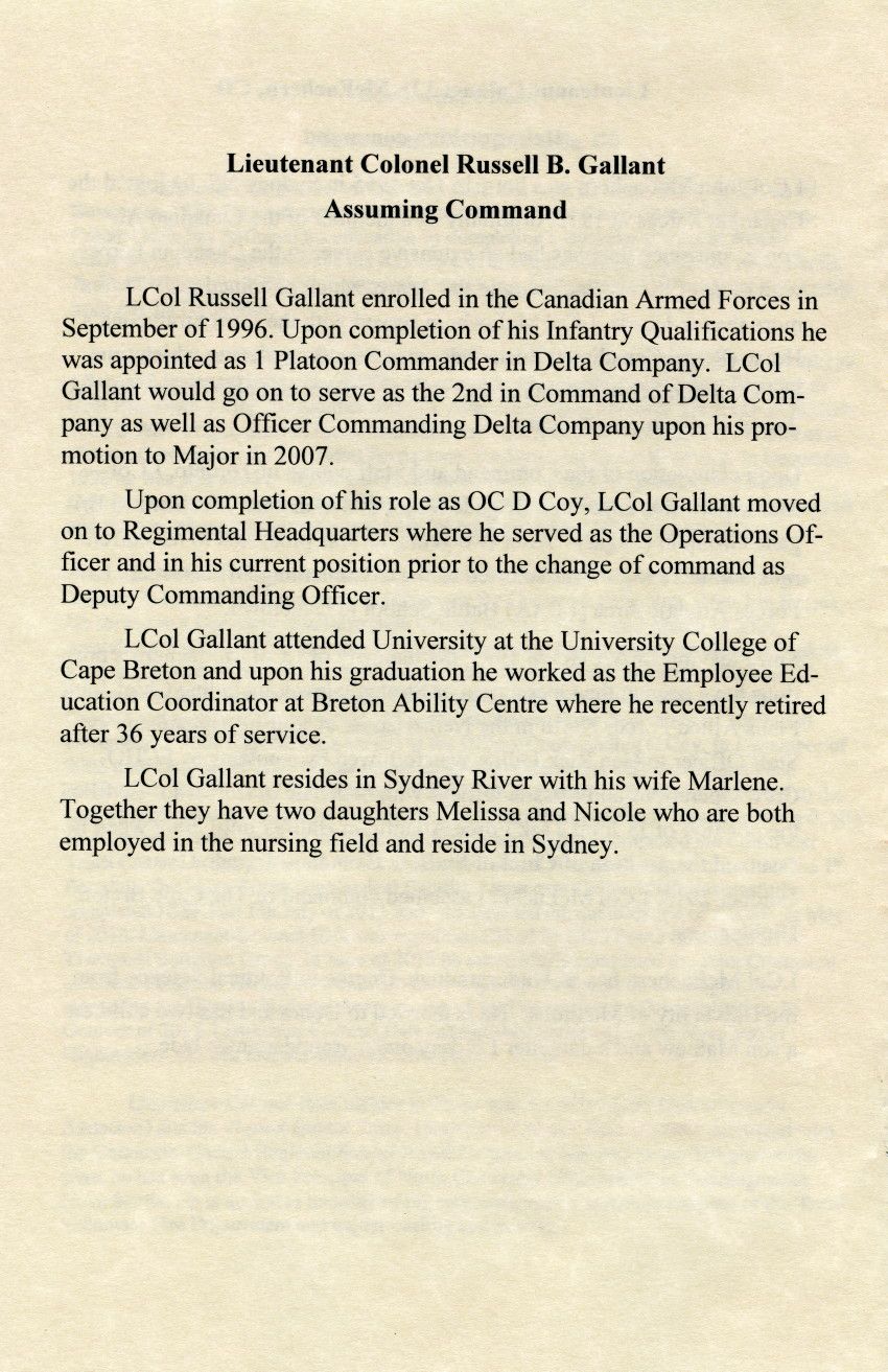 The incoming commanding officer of the battalion was Lt-Col. Russell B. Gallant. He commanded the unit from from October 4, 2014 to September 9, 2017.