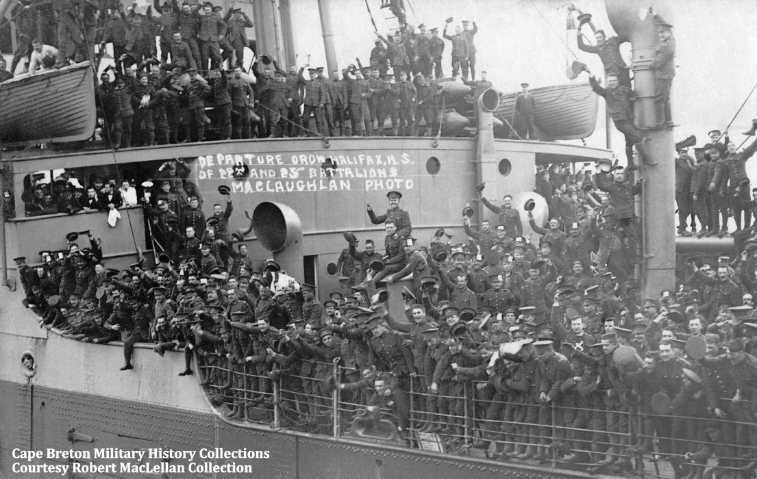 Men of the 25th Battalion (Nova Scotia Rifles) and 22nd Battalion (French Canadian) wave and cheer as His Majesty's Troopship Saxonia pulls away from the pier in Halifax. The 22nd Battalion was recruited in Quebec. The ship arrived in Plymouth, England on May 29, 1915.