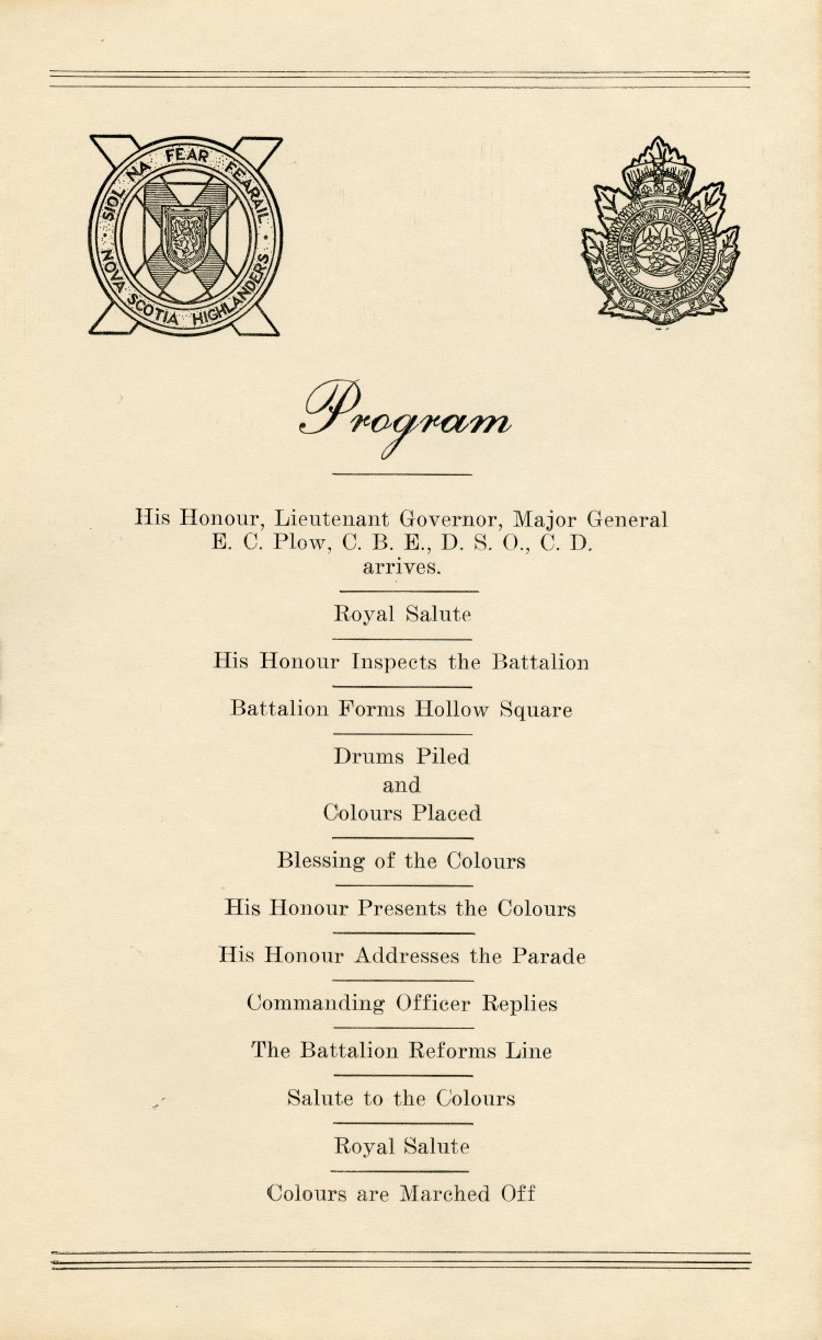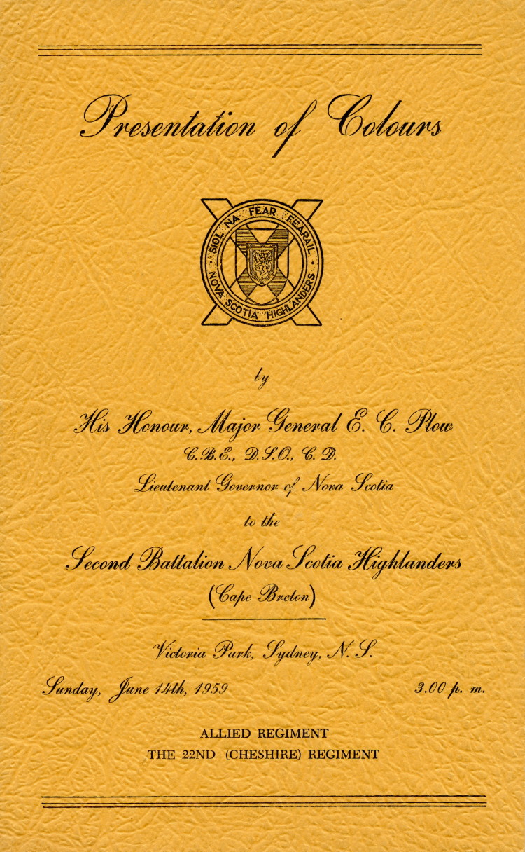 This section contains one program for the Presentation of Colours for the 2nd Battalion The Nova Scotia Highlanders (Cape Breton) at Victoria Park, Sydney, NS, on June 14, 1959.