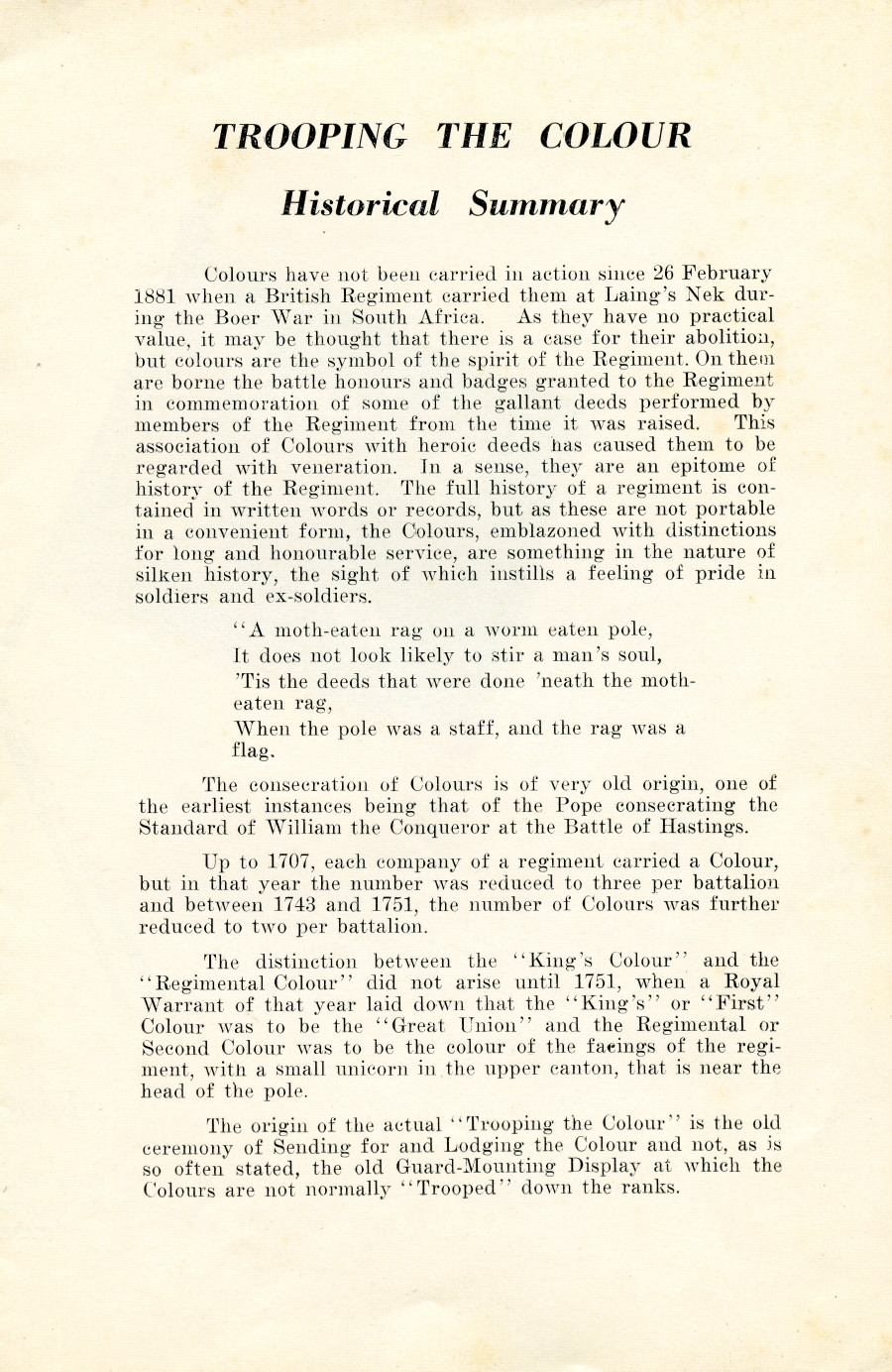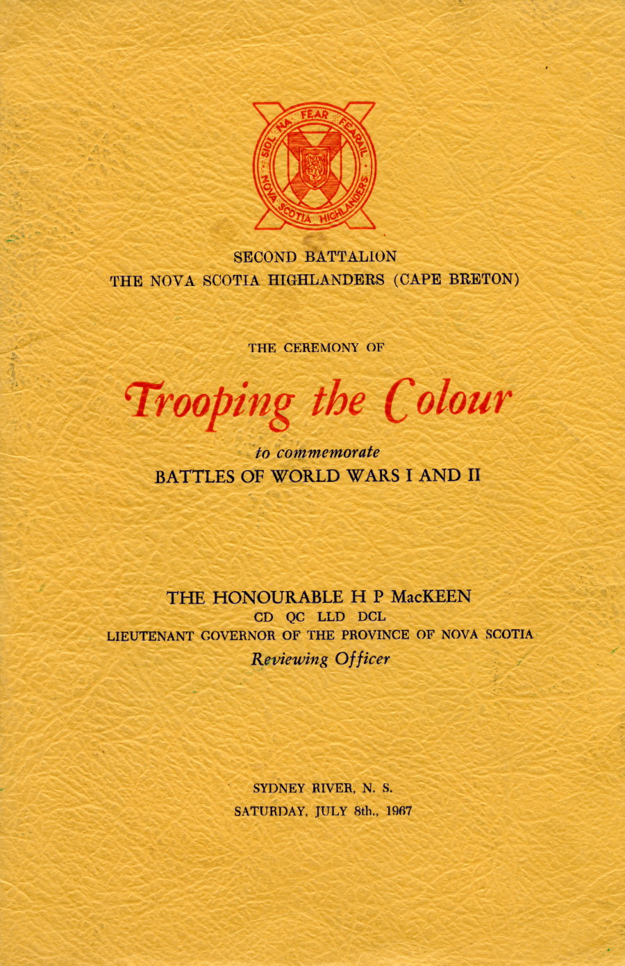 This section contains one 16 page program booklet for the Ceremony of Trooping the Colour for the 2nd Battalion The Nova Scotia Highlanders (Cape Breton) at Sydney River, NS, on July 8, 1967.