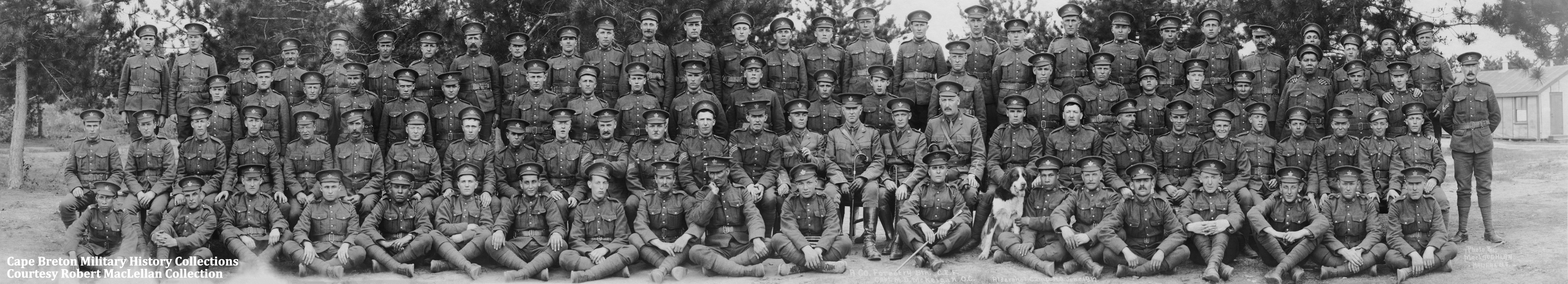 "A" Company was recruited in the Nova Scotia counties of Cape Breton, Inverness, Victoria and Pictou, from men who had experience working in the woods and in the lumber industry. In looking closely at the faces of the men in the photo, there appear to be a number of indigenous men in the unit.