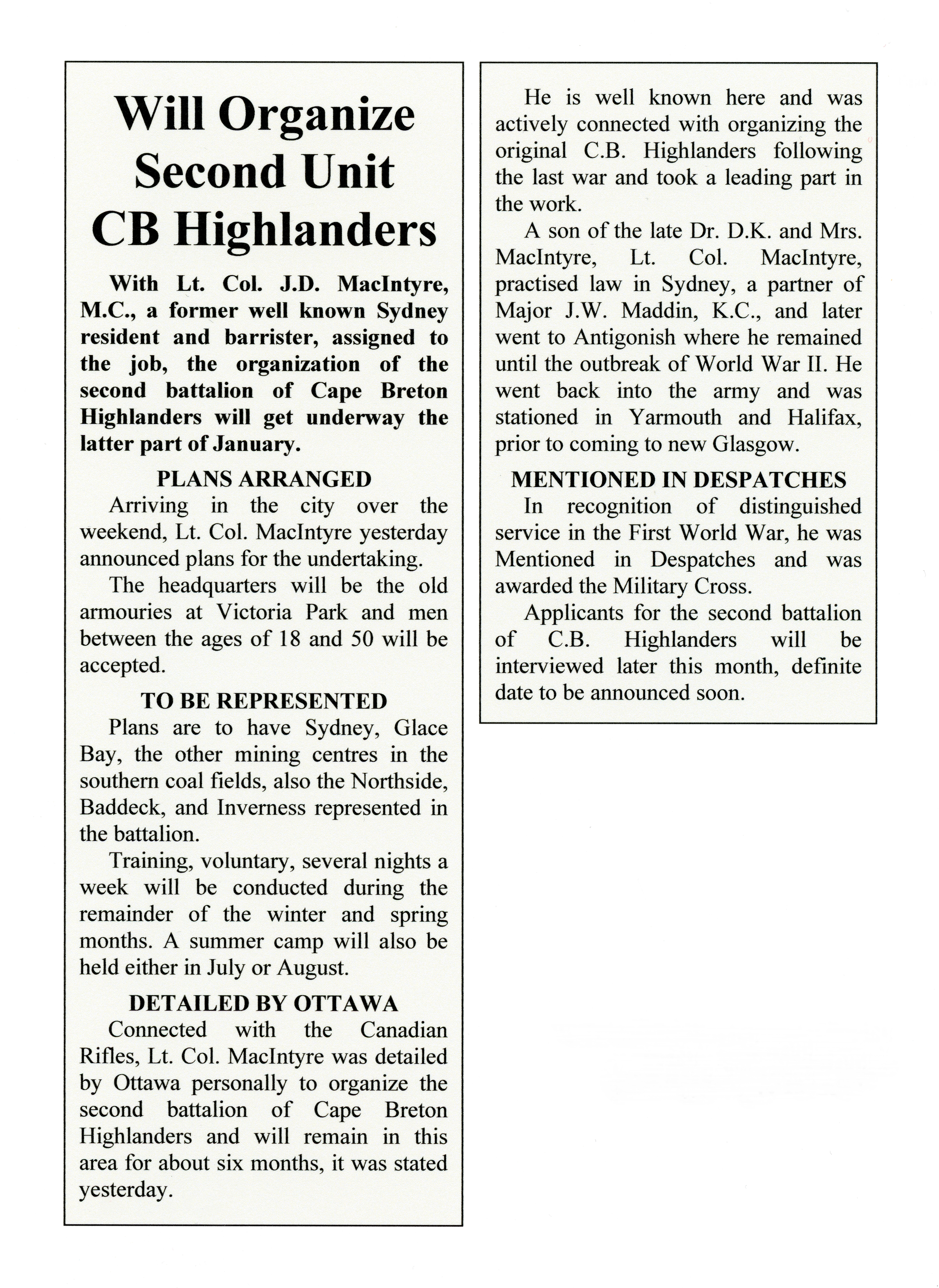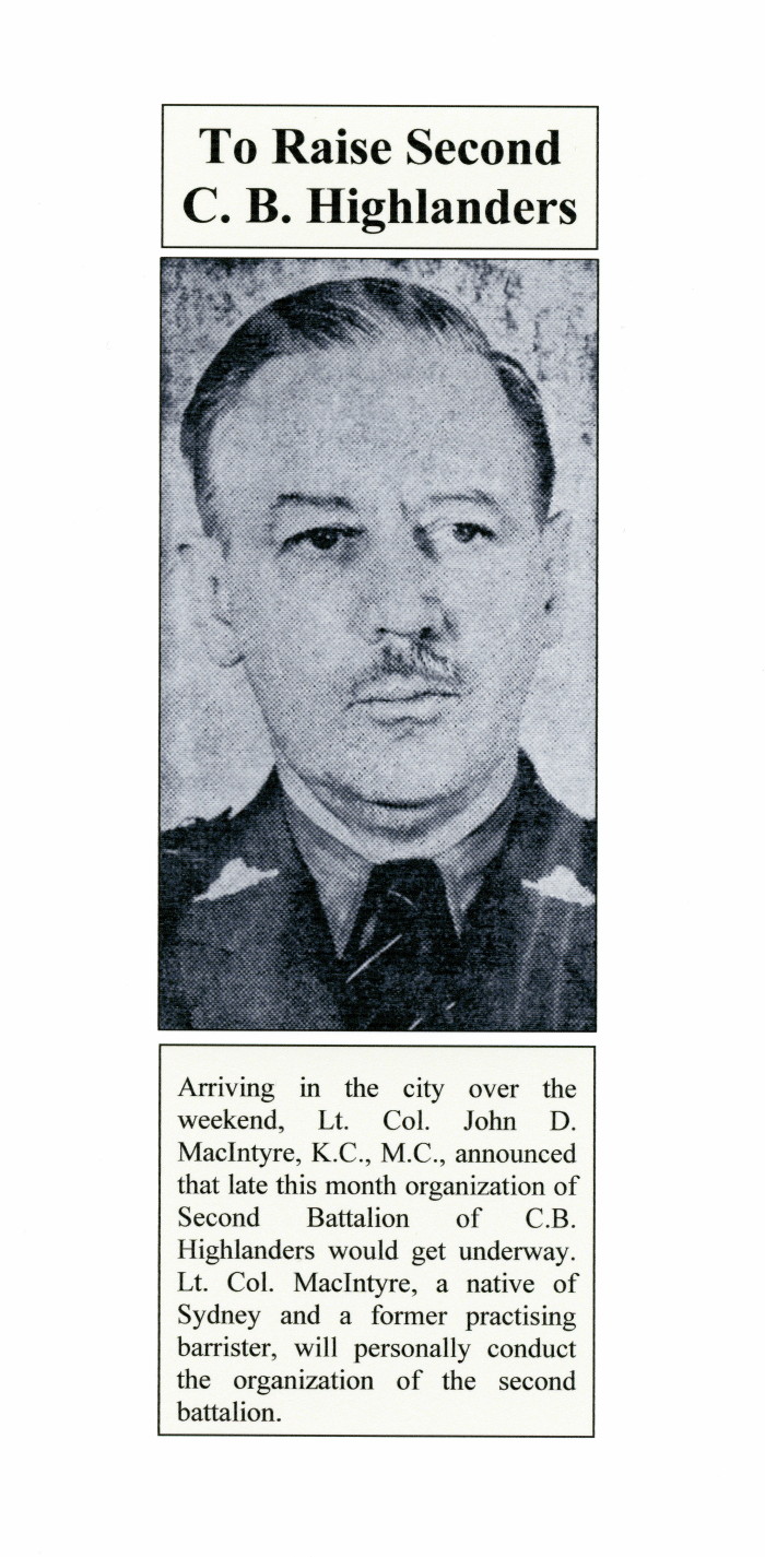 This section contains two transcribed newspaper article clippings pertaining to John Donald Macintyre, January 13, 1942. The articles are about John Donald Macintyre assuming command and organizing the formation of the 2nd (Reserve) Battalion Cape Breton Highlanders.