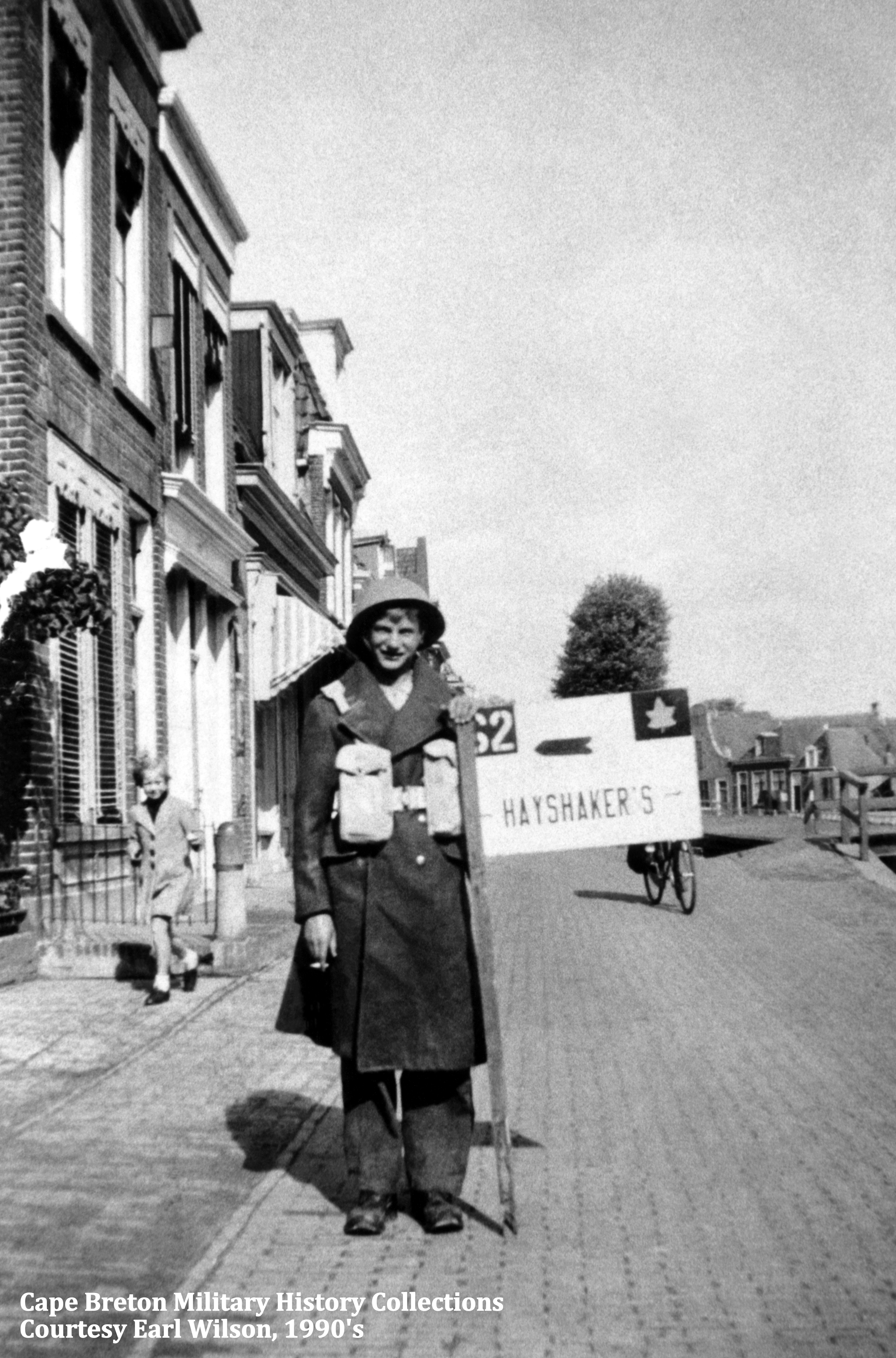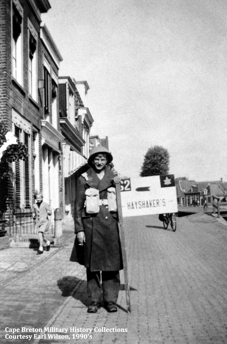 Standing in a street in Bolsward with an "A" Company sign is a Dutch teenager that "A" Company befriended and nicknamed "Spook". He is dressed in a Canadian army greatcoat and web gear, and appears to be wearing a Dutch army helmet. "A" Company were known as the Hayshakers. The 62 was the tactical number for the Cape Breton Highlanders.