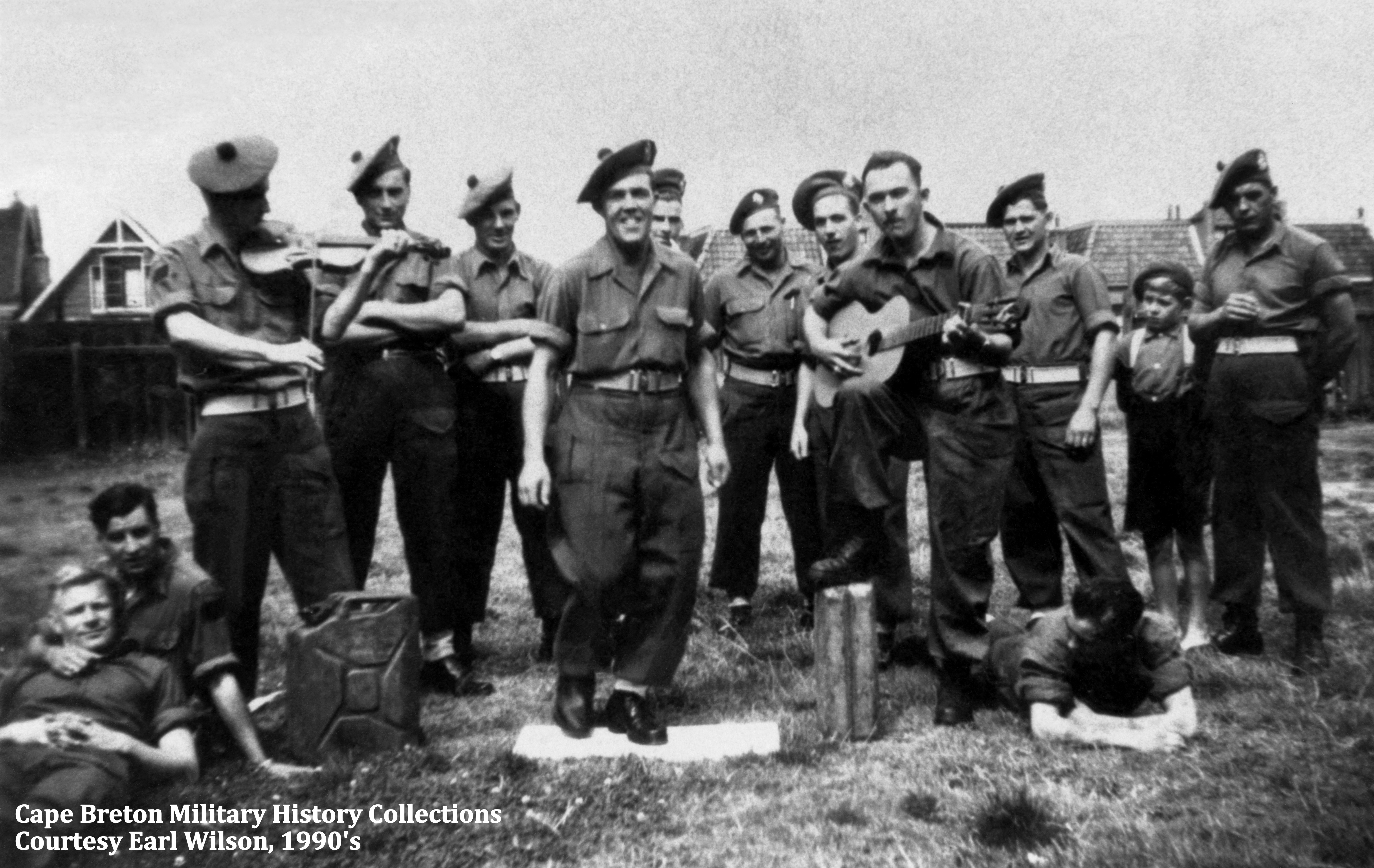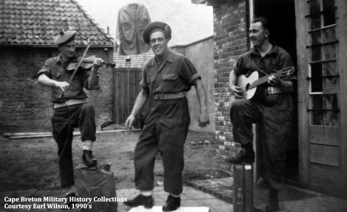Soldiers from "A" Company put on a Cape Breton style musical performance. The step dancer has been identified as Louie Broussard from Pomquet, a small Acadian community in Antigonish County, NS. The other men are unidentified. Note the young Dutch boy on the right of the photo.